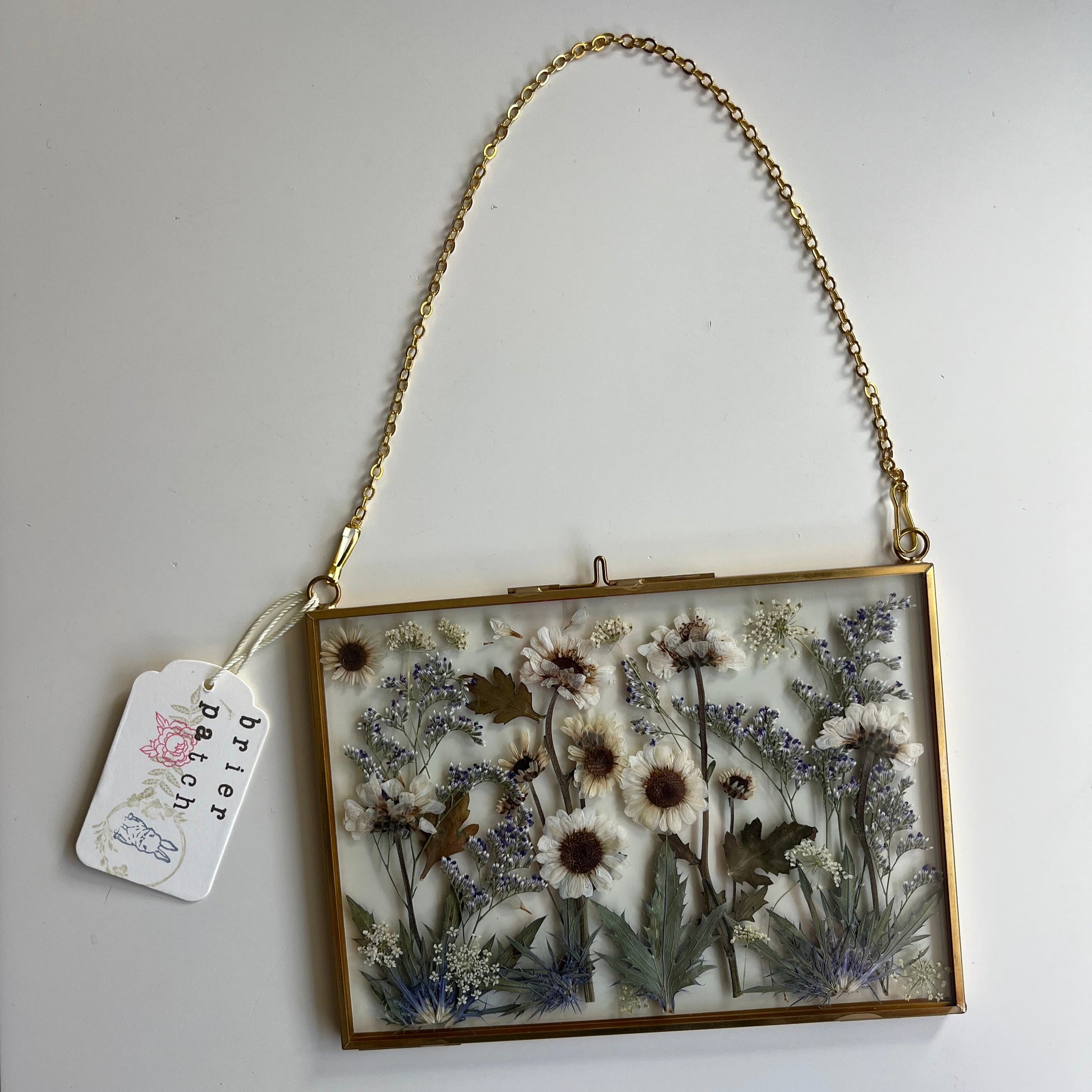 Pressed floral art made with real botanical materials. Hand pressed flowers creatively arranged in a 7 x 5 inch brass hanging floating frame with chain.