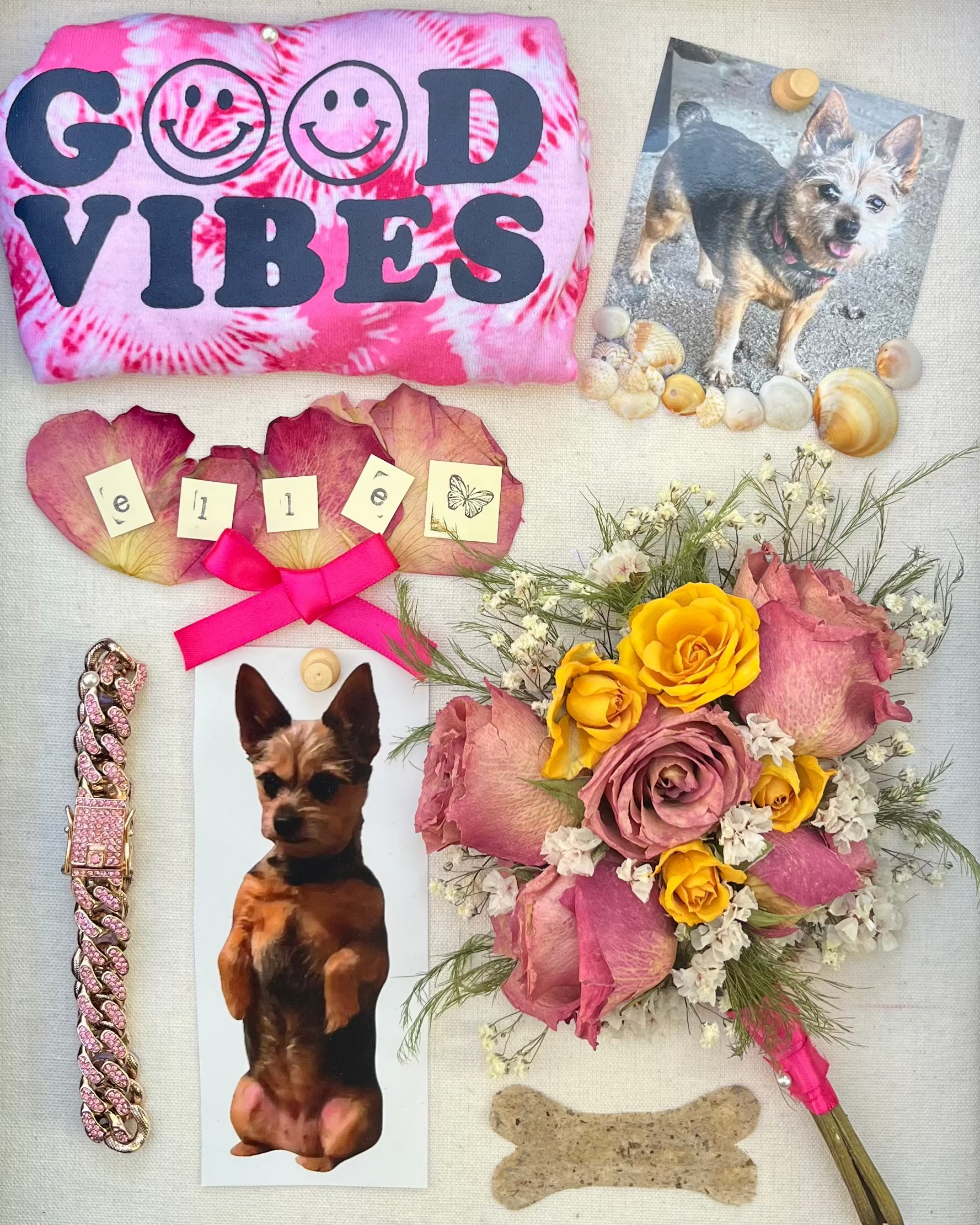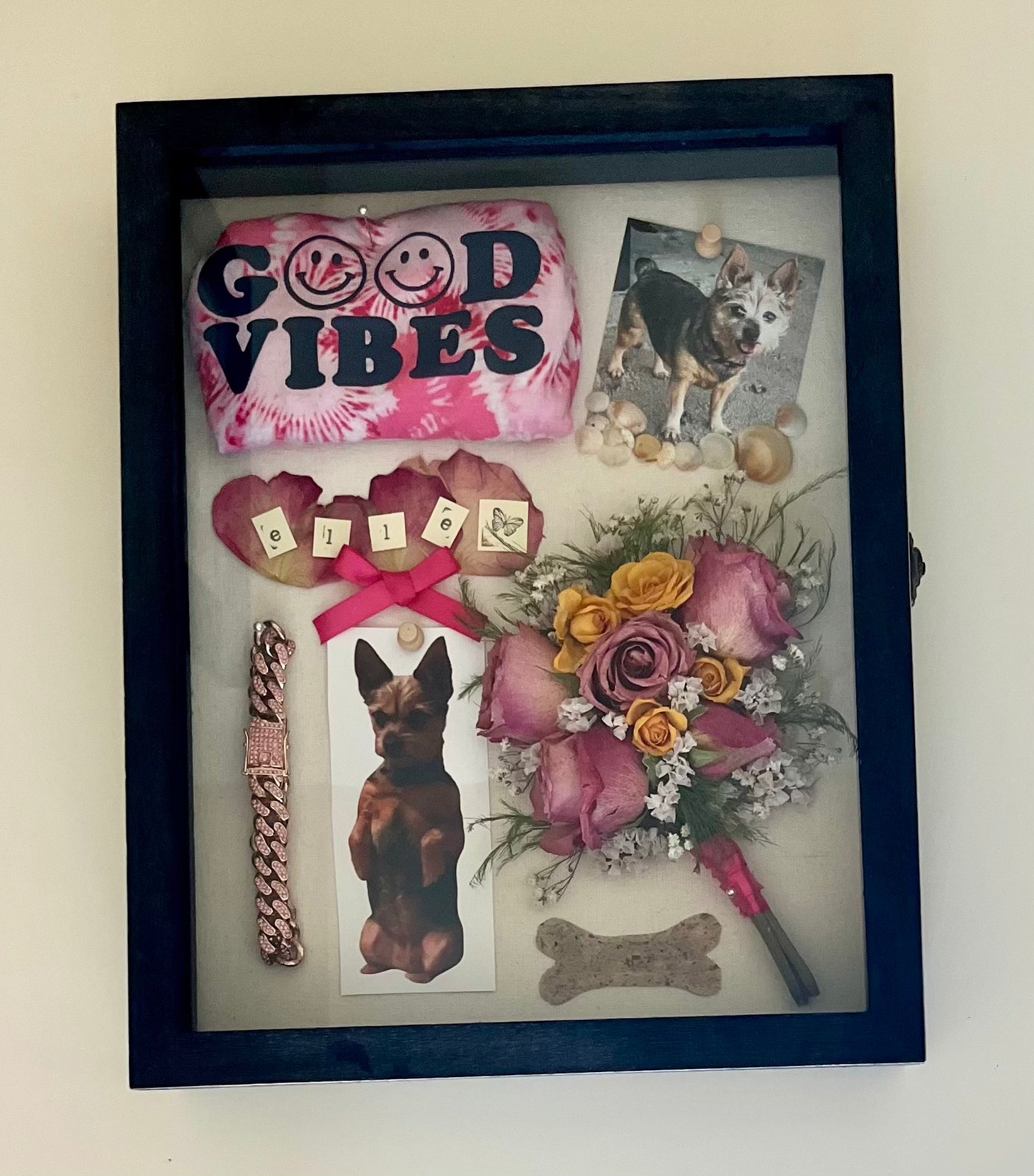 Pet keepsakes thoughtfully arranged in a 13 x 16 inch black vintage-style shadowbox.