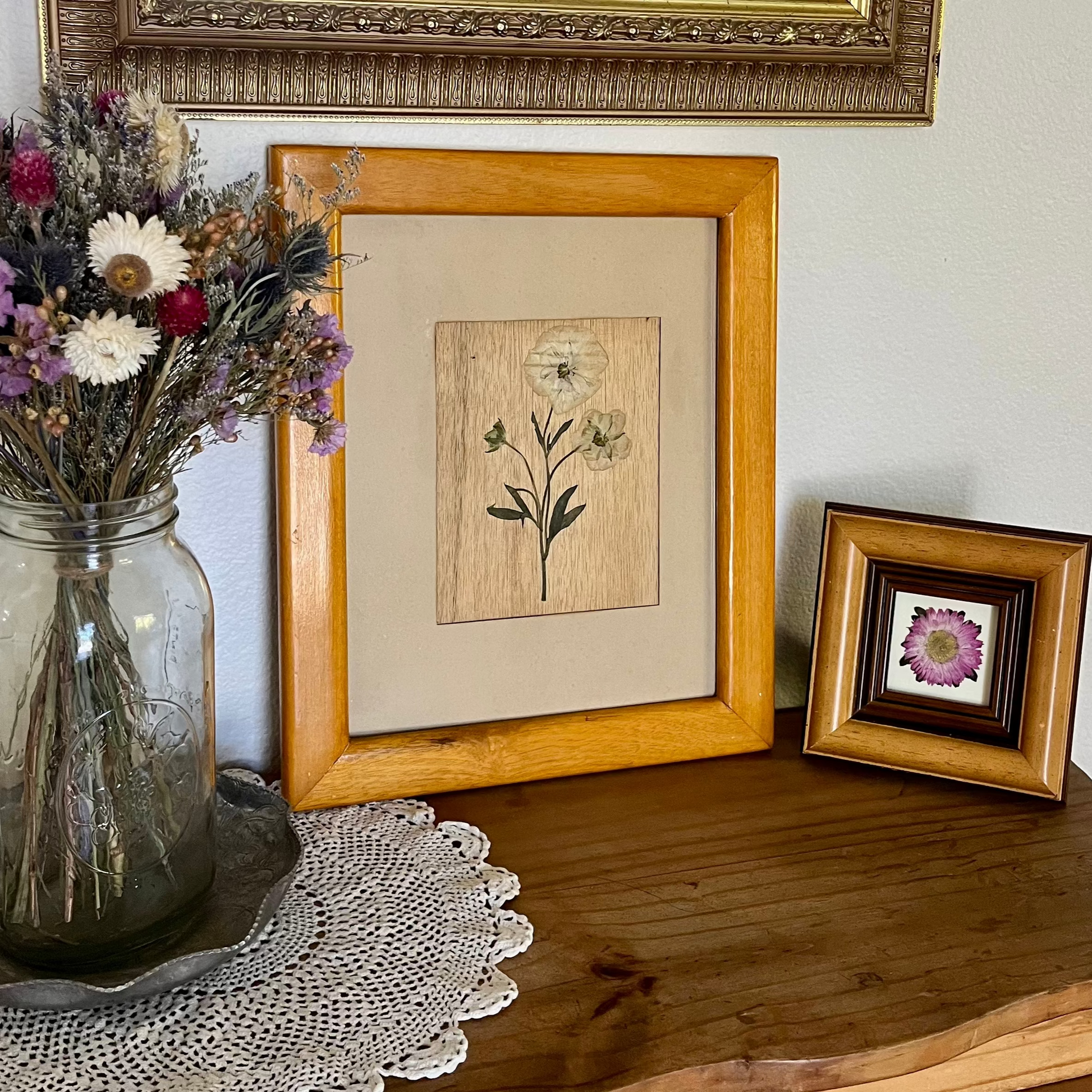 Pressed floral art made with real botanical materials. Hand pressed flowers arranged in a refurbished secondhand 12.5 x 15 inch vintage wooden frame.